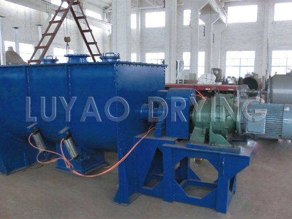 Horizontal spiral belt mixer is installed in the mixing shaft inside and outside diameter spiral driven material inside the barrel turnover, so that the mixer in the barrel inside a wide range of turning animal material. In the structure of the agitator, the screw is designed to be inside and outside, left and right reciprocal spiral. The material near the axis is driven by the screw to rotate in the agitator, and the material near the axis is driven by the axial from inside to both sides. The material near the cylinder wall is driven by the external screw to rotate in the axis, and the axial direction is driven from both sides to inside. Shearing and mixing to complete the quick and even mixing of materials in a short time.